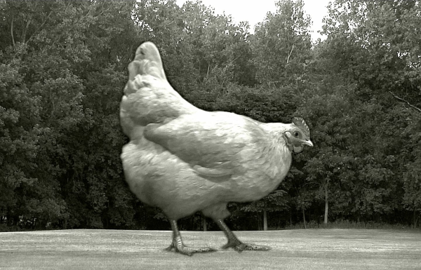 VERY LARGE chicken on (what we presume to be) a rampage! Something interesting we noticed: the area where this (presumably) out-of-control fowl is running amok looks very similar to the area where the dinosaur chased young Danny Johnson in "