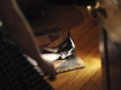 Mary, played by actress Catherine Hansen, left, stands in a doorway shocked to see Ursula, played by Stephanie Mihm, lying unresponsive on the floor frightened to death, we later learn, by a ghost during the filming of "House of Ghosts." (Pioneer Press: Chris Polydoroff) |