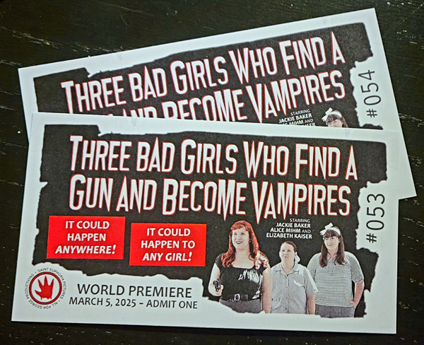 Can you believe the world premiere of the next great Mihmiverse movie, "Three Bad Girls Who Find a Gun and Become Vampires," is only TWO WEEKS AWAY!? In fact, in exactly two weeks from the moment this update is being posted, the doors will be opening!