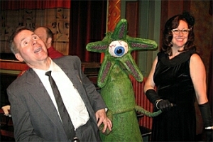 Anthony Kaczor (Eh'Donish Man) and Sid Korpi (Eh'Donish Woman) pose with the alien ambassador from planet Snox, Ge'off |