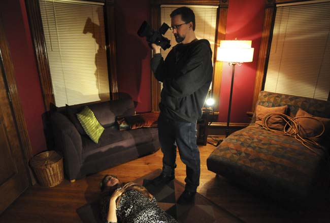 Mary, played by actress Catherine Hansen, left, stands in a doorway shocked to see Ursula, played by Stephanie Mihm, lying unresponsive on the floor frightened to death, we later learn, by a ghost during the filming of "House of Ghosts." (Pioneer Press: Chris Polydoroff) |